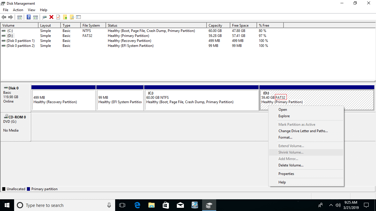Both Shrink and Extend Volume only support NTFS partition, FAT32 and any other types of partitions cannot be shrank or extended. When you right click these partitions, Shrink Volume is grayed out.