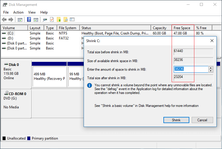 As you see in the screenshot, there's 47.88GB free space in my C: drive, but Disk Management gives only 38236MB available space to shrink.