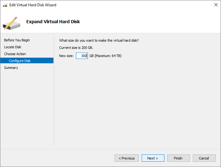 Note: you should indicate absolute path and name of the .vhd/.vhdx file with quotes. 200gb means resizing original disk to 200GB, original disk could be larger or smaller than 200GB.