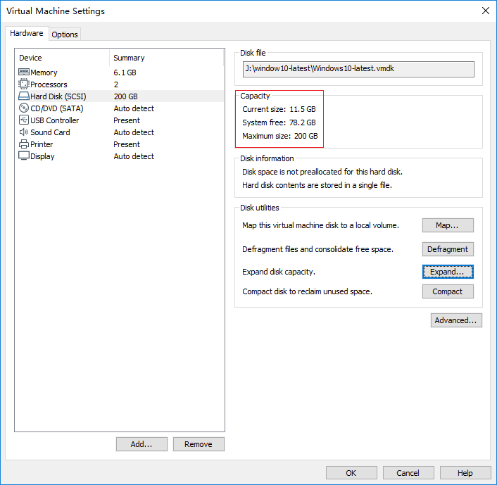 - .vmdk file of the virtual disk that you want to expand, in my computer, it is in "J:\window10-latest"