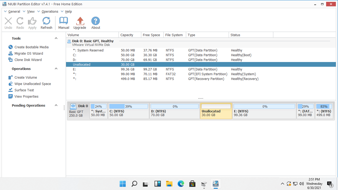 Download this free partition manager, you'll see all storage devices with partition structure and other information on the main window. There's 30GB unallocated space which is shrunk from D drive.