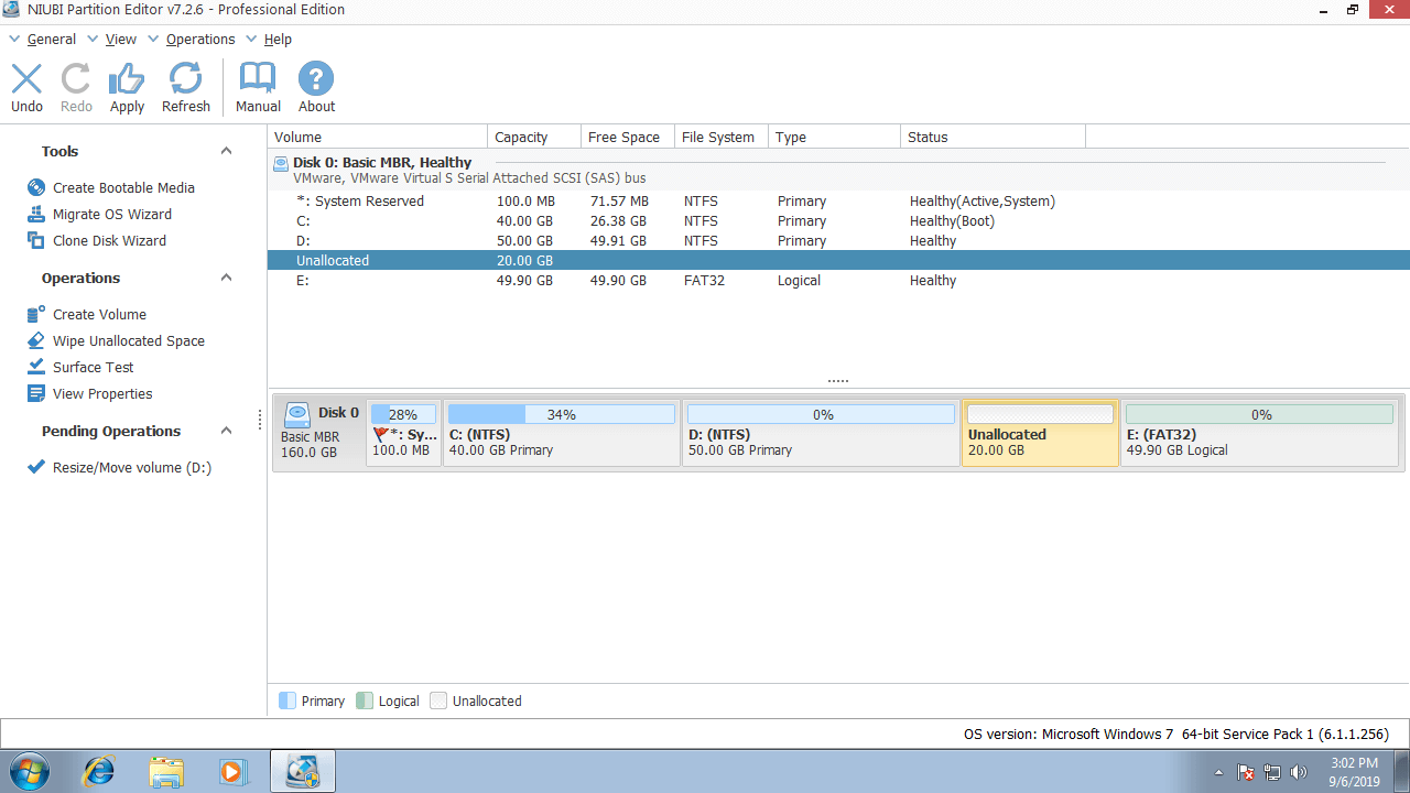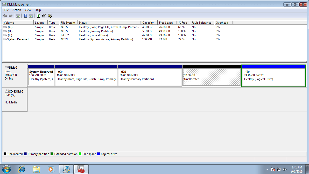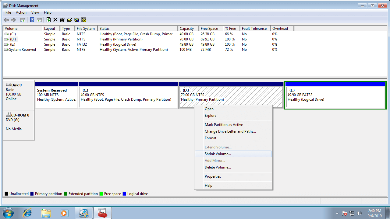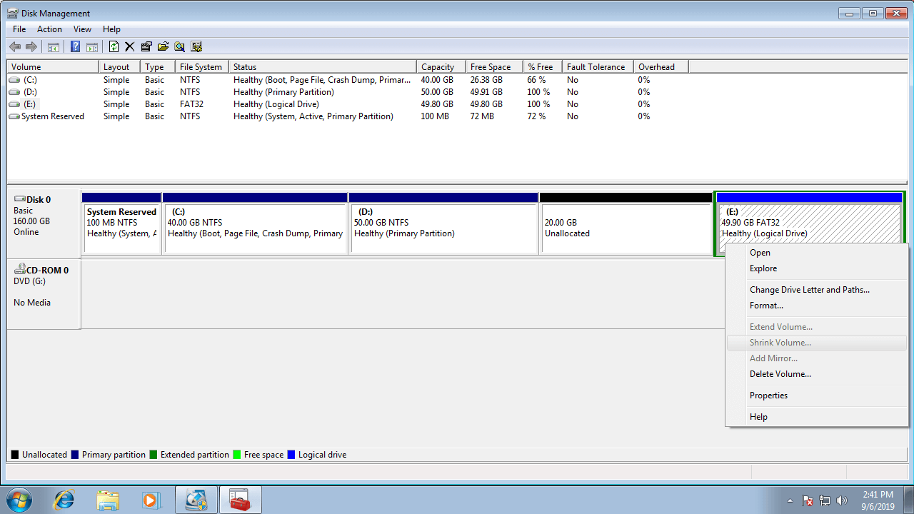 In a short while, this partition is shrunk and 20GB Unallocated space is made on the right side of D. If you right click drive E (FAT32), Shrink Volume is disabled.