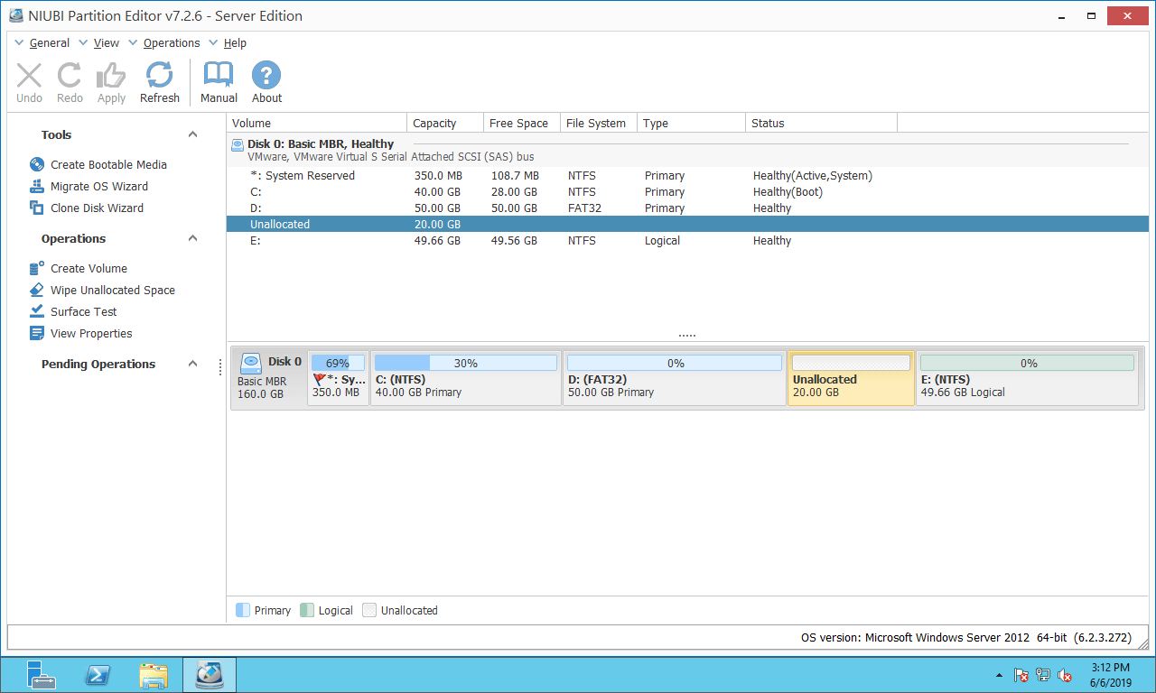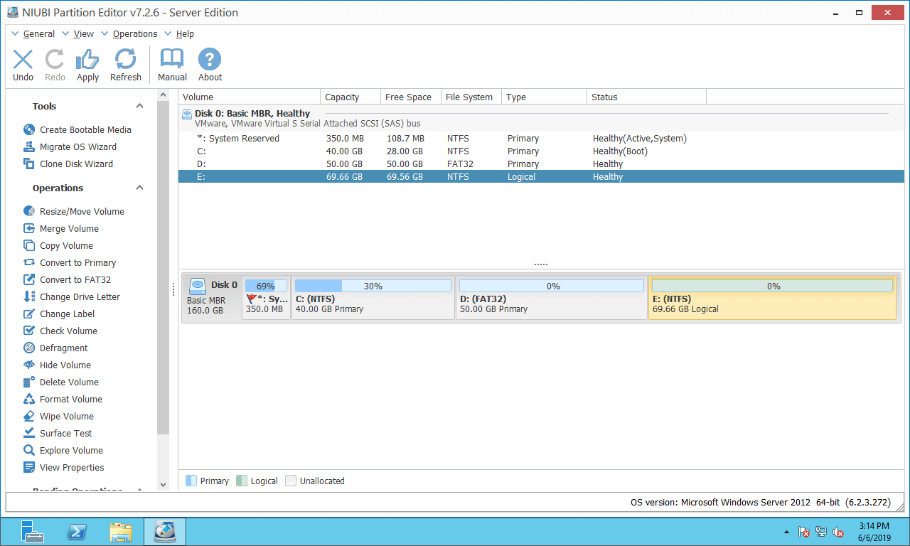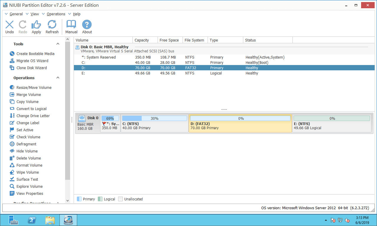 Besides moving and merging unallocated space in Windows Server 2012/2016/2019/2022/2003/2008, NIUBI Partition Editor helps you copy, merge, convert, defrag, scan, hide, wipe partition and much more.