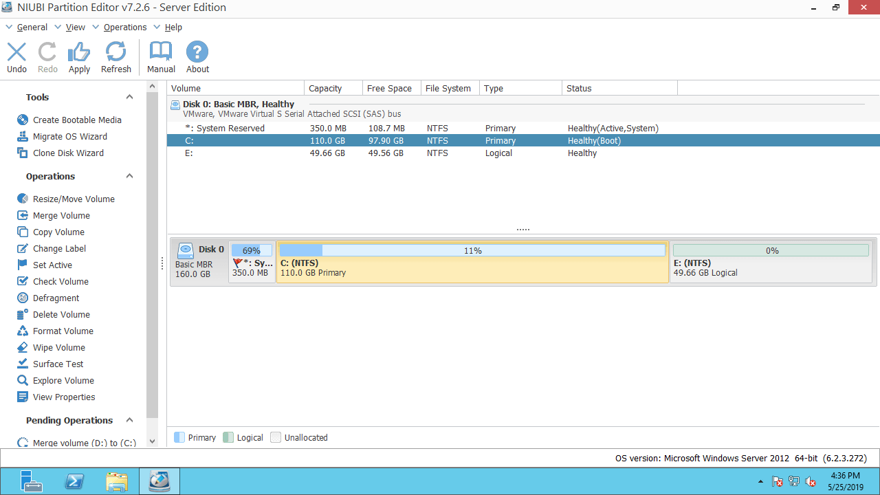 Download NIUBI Partition Editor you'll see all connected disk partition with structure and other information on the right, available operations to selected to disk or partition are listed on the left or by right clicking.