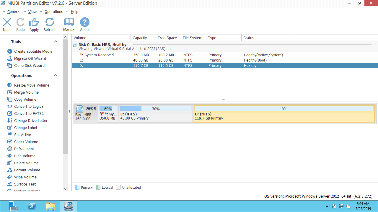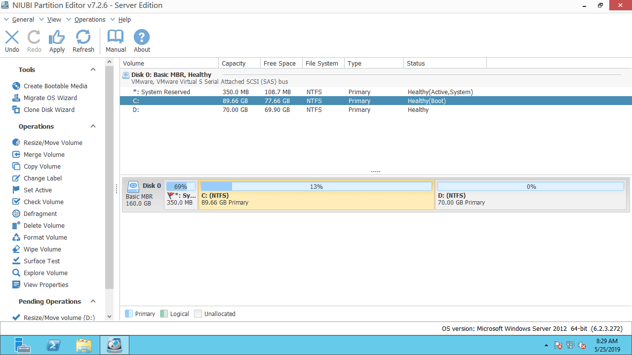 Besides shrinking, extending and merging partitions in Windows Server 2012/2016/2019/2022/2003/2008, NIUBI Partition Editor helps you move, copy, convert, defrag, wipe, optimize, hide, create, format partition and much more. Any types of SSD, HDD, RAID, VMware and Hyper-V virtual machines are all supported.