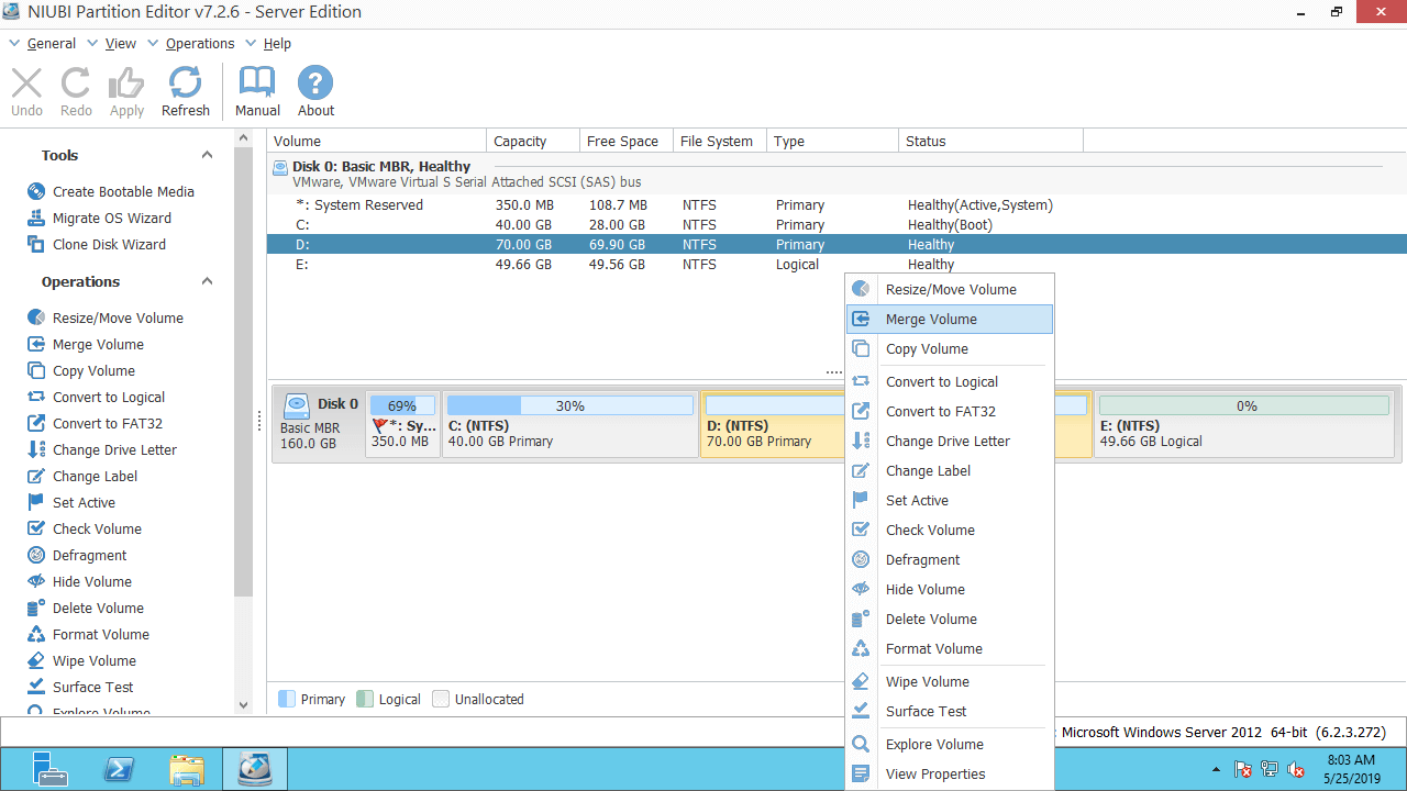 1. Merge partitions in Server 2012 Disk Management
