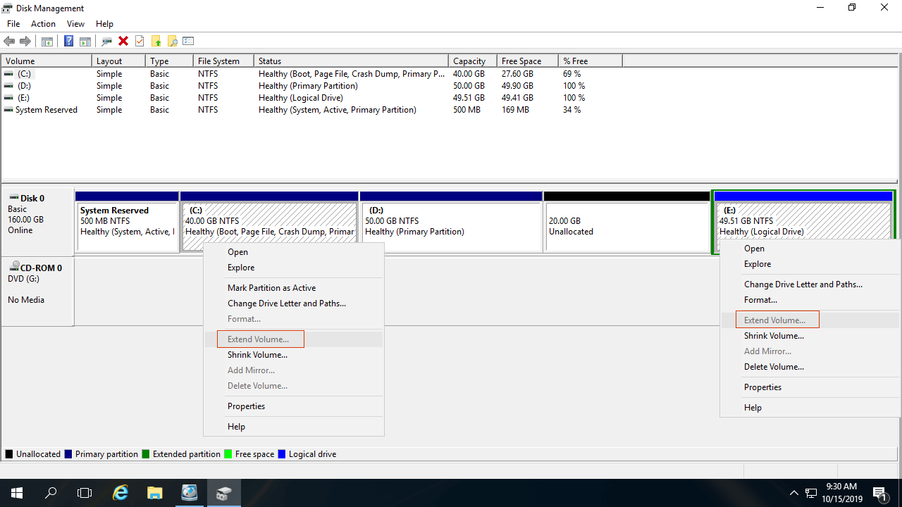 To do this, Windows native Disk Management and diskpart command cannot help you, although there are "Shrink Volume" and "Extend Volume" functions to help resize disk partition. As you see in the screenshot, Extend Volume is disabled for C and E drive after shrinking D.