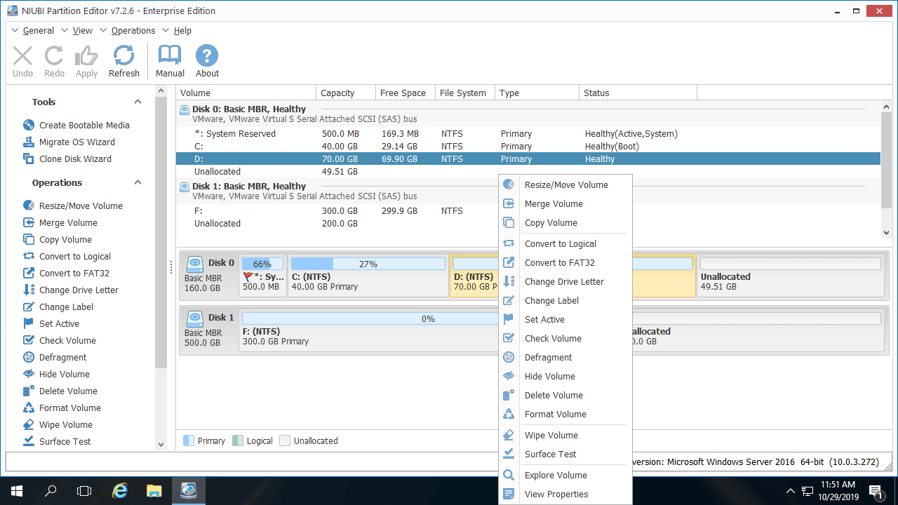 Download NIUBI Partition Editor, you'll see all disks with partition structure and other parameters on the right, available operations to selected disk and partition are listed on the left and by right clicking.