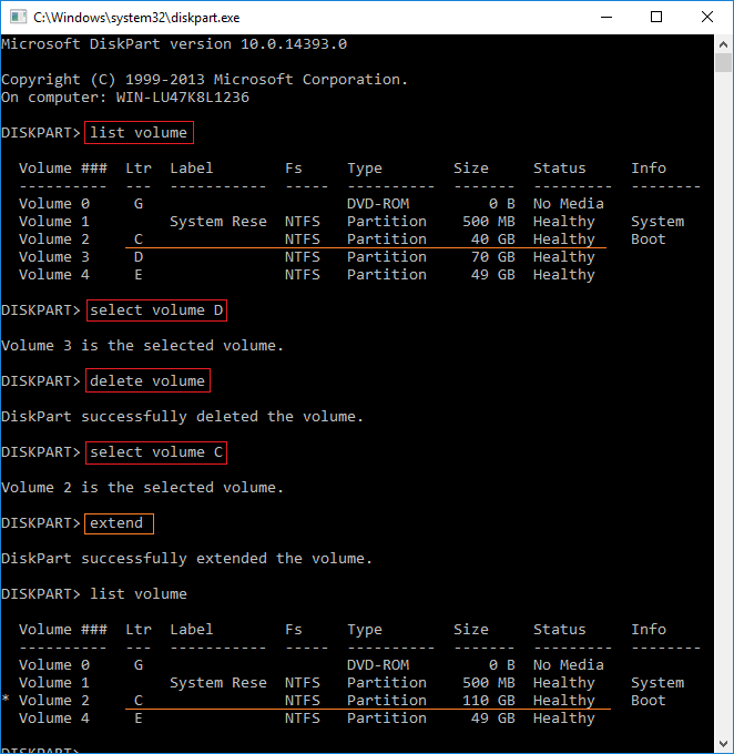 In a short time, diskpart reports successfully extended the volume. Type list volume again, as you see, my C drive is increased from 40GB to 110GB.
