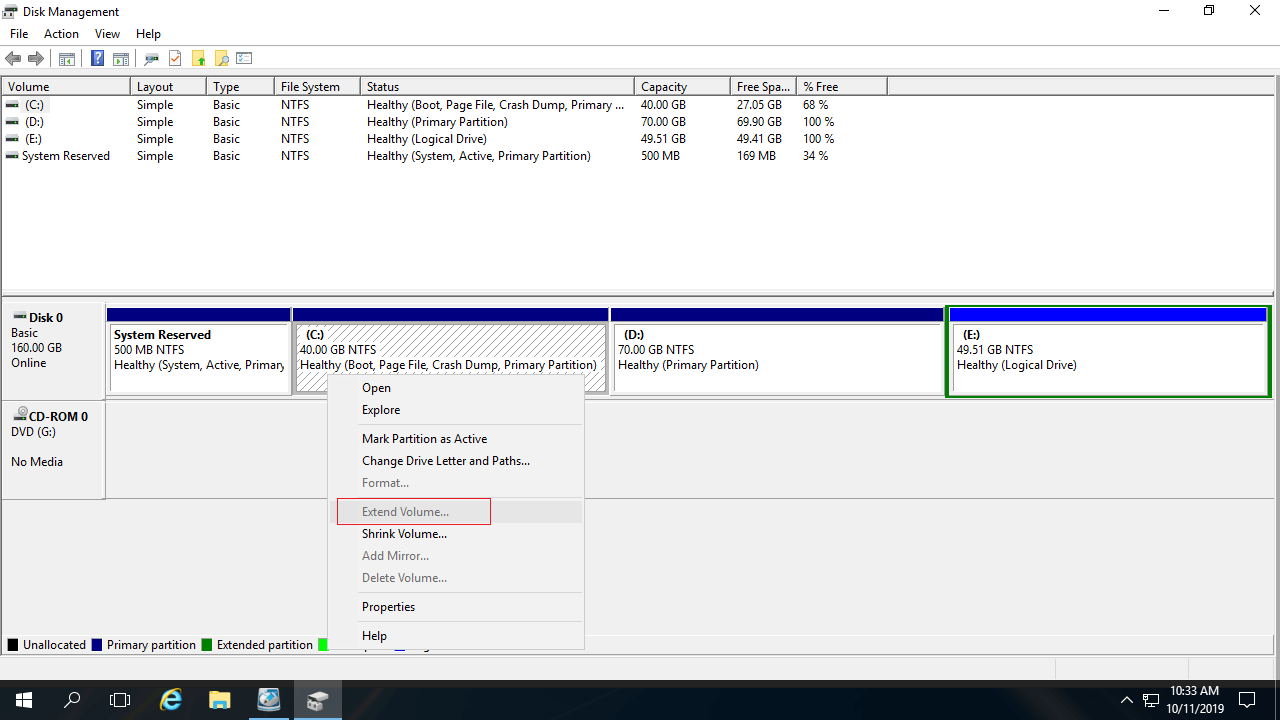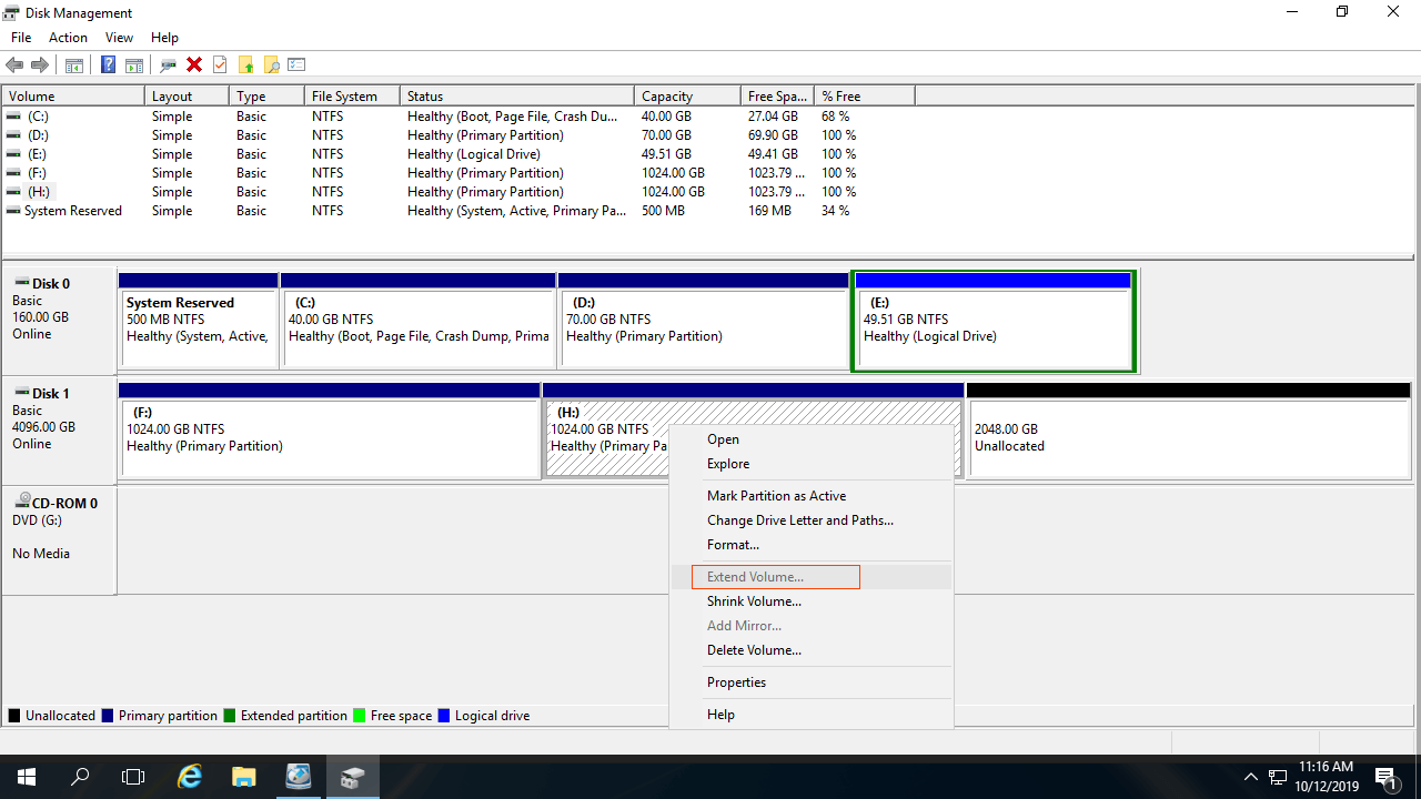 Steps when Extend Volume greyed out in Server 2016 after shrinking D drive: